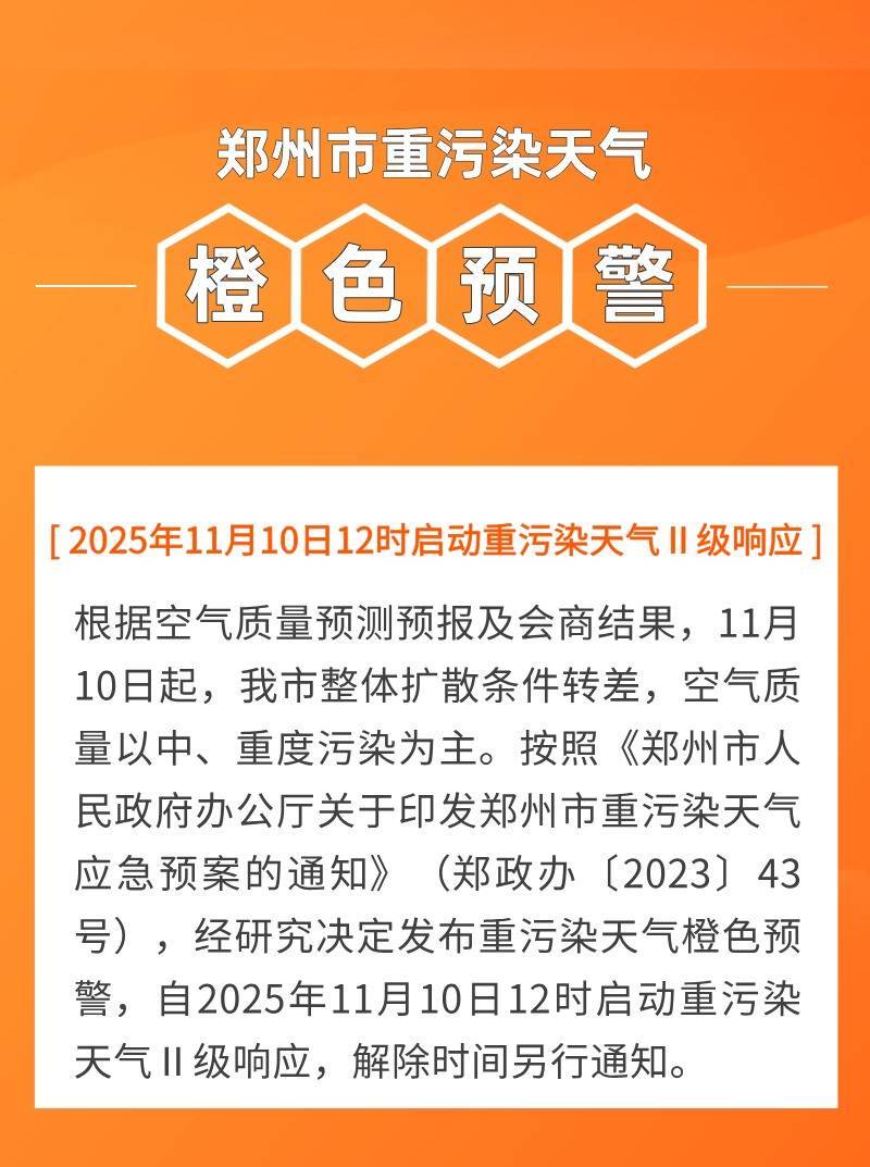【大河财立方消息】11月10日,据郑州市生态环境保护工作专班污染防治攻坚办公室,根据空气质量预测预报及会商结果,11月10日起,郑州市整体扩散条件转差,空气质量以中、重度污染为主。经研究决定发布重污染天气橙色预警,自2025年11月10日12时启动重污染天气Ⅱ级响应,解除时间另行通知。