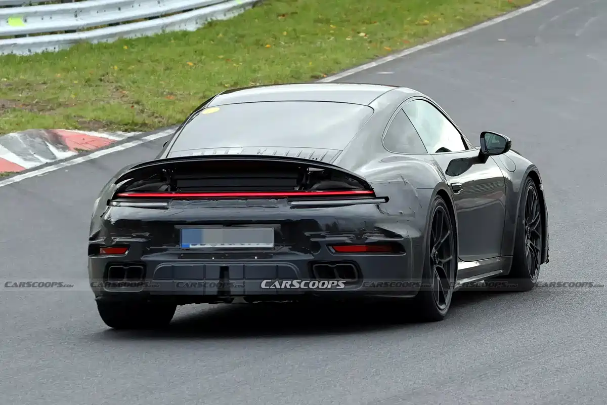新的的车头和敞篷版一样,在主动式百叶窗通风口外侧增加了横向饰条装饰,车侧后翼子板处虽然通过胶布伪装,但基本可以肯定它将会配备Turbo车型标志性的进气口为3.6T水平对置6缸发动机提供充足的进气量。既然是Touring版,它最大的看点就在于尾部采用主动式扰流板,这个设计先不论实用性如何,起码足够吸睛。